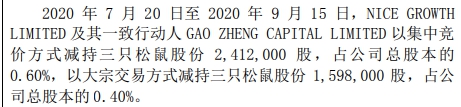 公告还显示,2020年7月20日至2020年9月15日,NICE GROWTH LIMITED及其一致行动人GAO ZHENG CAPITAL LIMITED以集中竞价方式减持三只松鼠股份241.20万股,占三只松鼠总股本的0.60%,以大宗交易方式减持三只松鼠股份159.80万股,占公司总股本的0.40%。