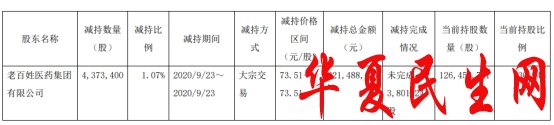 本次股份减持计划实施前,医药集团持有老百姓股份1.31亿股,占公司总股本的32.01%。2020年9月23日,医药集团通过大宗交易方式减持公司股份437.34万股,减持比例占公司总股本1.07%,减持价格为73.51元/股,减持总金额3.21亿元。