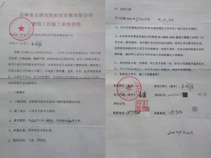 被害人王国厚告诉记者,2016年9月,他们在“政府项目”的吸引下,全国各地有11支工程队200多名农民工陆续被骗进驻大安市红岗子乡马营村,都是以个人的名义与友联公司签定了近7000栋温室大棚的建设合同,总额高达14亿元 。