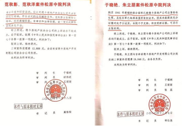 更为令人震惊的是,在吉林省高级法院和松原市中级法院已经做出生效判决,驳回112户的诉讼请求后,2021年4月21日,扶余法院又重新审理德卡城市广场二楼112户其中一户的代租合同纠纷案件,判决我公司败诉。扶余法院竟重复审理浪费法律资源,并且随意改判。现在德卡城市广场已经关停营业来应对官司。我们认为,这已经不仅仅是浪费司法资源和枉法裁判的问题了,简直就是对企业的围堵和谋杀!在如此恶劣的司法环境下,企业将如何生存?德卡公司为当地解决2000多人的就业难题,累计给当地创造了5000多万元的税收。但是,当地政府和法院却非要把企业赶尽杀绝!这是令人不能理解的。