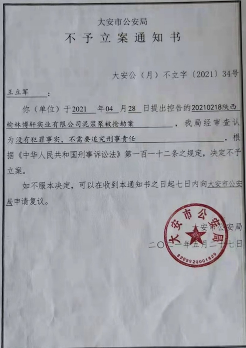 本站讯 2021年2月份以来,陕西省的一家公司在吉林省大安市遇到了一件令他们纠结的事:钻井设备被人强行拉走了,他们报案了,警察出警后,却不制止,之后公安局也不立案。他们多次咨询律师,律师们认为对方构成抢劫犯罪。因此,他们不断的向各级反映,却始终都见不到领导,通过热线电话反映问题后,热线也只能依据大安警方的说法回复他们。他们想通过媒体把事情发到网上,让领导们和广大网友看看对方是否构成犯罪。