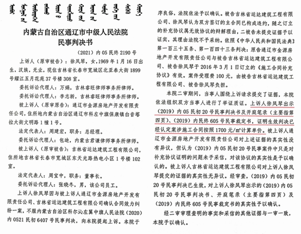 徐凤琴上诉后,通辽中院经过开庭审理,在先后做出(2019)内05民初20号民事判决书、(2019)内民终605号民事裁定书后,2021年9月1日,又做出(2021)内05民终2190号民事判决书,依据双方签订的合同和相关法规,判决认定案涉工程造价按照每平米1700元计算单价,再次坚决次纠正了科左中旗法院关于吉地华府工程承包单价的违法判决!做出这一公正判决法官的名字是审判长白丽、审判员张雷、董明华,这一公正判决,为徐凤琴直接挽回损失800万元!