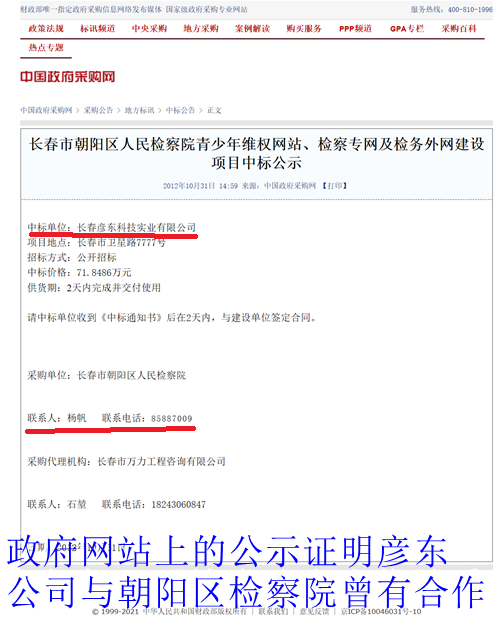 众多被害企业老板还说:合同上加盖了检察院公章和检察长的法人章后,他们也还是不放心,又到政府网站上查询一番。在中国政府采购网上,他们查询到了“长春市朝阳区检察院计算机设备采购项目公开招标公告”(截至记者发稿时,该公告还挂在政府网站上),这份公告明确证明:朝阳区检察院的设备采购负责人就是杨帆!他们还查询到,长春盛鼎科技有限公司(简称盛鼎公司)和彦东公司就是朝阳区检察院设备采购招标的中标单位!