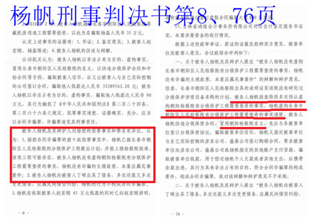 长春市二道区法院作出的(2021)吉0105民初264号民事判决书称:“结合朝阳检察院在2021年1月27日出具的说明,可以认定原、被告双方对于朝阳检察院已经收到的货物进行了核对,清单中载明所有产品被告均已收到,所有产品已经安装完毕交付被告使用,且经本院实地踏查、被告方现仍在使用。故原告诉请被告支付该部分工程款,有事实及法律依据,应子支持。”但仍称“本案系基于杨帆实施诈骗行为导致原告财产损失的事实而引发的纠纷”。也就是说,此案仅仅是杨帆个人实施的诈骗案子,与检察院无关!
