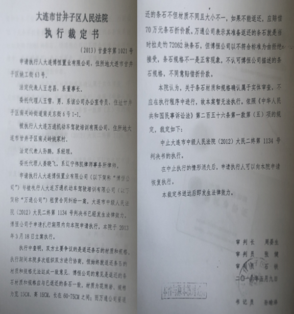 至此,两级法院对此案做出的判决已经生效,正式进入执行程序。随后,博恒公司于2013年3月18日向甘井子区法院申请执行。但据博恒公司提供的证据证明,该院执行法官周宴生拒不执行,虽然大连市中级法院多次催办,至今仍没有任何结果。周宴生先是站在被执行人立场上指责大连中院(2012)大民二终字第1134号终审判决存有瑕疵,在判决生效四年后的2016年5月9日裁定“中止大连市中级法院于2012年12月3日作出的(2012)大民二终字第1134号民事判决的执行”,理由是“条石材质和规格确认属于实体审查,不应在执行程序中进行,故本案暂时无法执行。”但是多年来,申请执行人曾多次邀请负责执行法官到公司现场来,亲自查看一下判决书明确的已返还条石的材质和规格是没有瑕疵的,但他一次都没有来过。申请执行人收到“中止执行裁定”后,向大连中院申请再审,中院经审查未予立案。后申请执行人向中院和省高院多次投诉,得到了中院法官的认真接待和重视。期间,博恒公司接到了大连中院执行局的电话通知,告知申请执行人该案仍由甘井子法院恢复执行。后来,大连中院对本案进行审查研究,认为据以执行的生效判决并无瑕疵,应继续执行,并向甘井子法院下达了督办函,但至今仍未执行。
