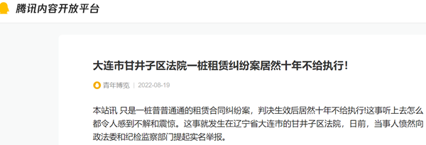 本站讯 只是一桩普普通通的租赁合同纠纷案,判决生效后居然十年不给执行!这事听上去怎么都令人感到不解和震惊。这事就发生在辽宁省大连市的甘井子区法院,日前,当事人愤然向政法委和纪检监察部门提起实名举报。