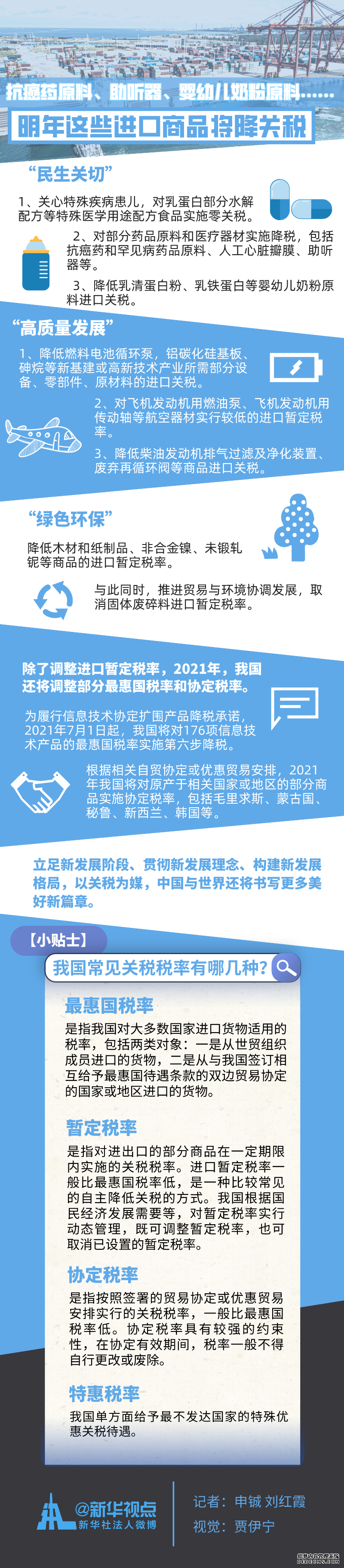 每逢年末,我国都会根据经济社会发展情况对新一年的部分商品的关税税率进行调整。国务院关税税则委员会23日印发2021年关税调整方案,决定从明年1月1日开始,对883项商品实施低于最惠国税率的进口暂定税率,抗癌药原料、助听器、婴幼儿奶粉原料等跟百姓生活密切相关的商品均在其中。同时,随着中国对外开放持续扩大,部分协定税率、最惠国税率也将在明年降低。(记者申铖、刘红霞)