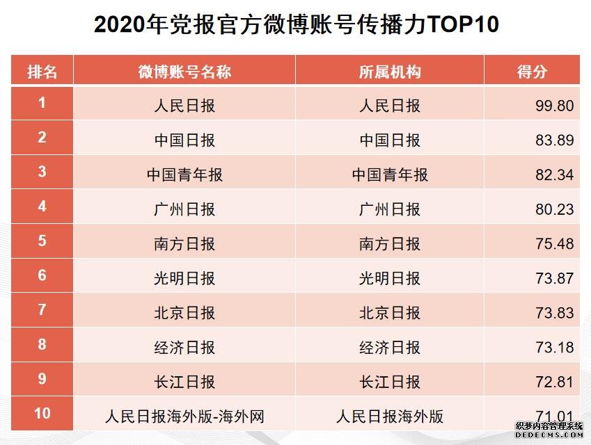综合微博粉丝、发文量及互动情况,党报微博传播力排名前十的账号如图所示。