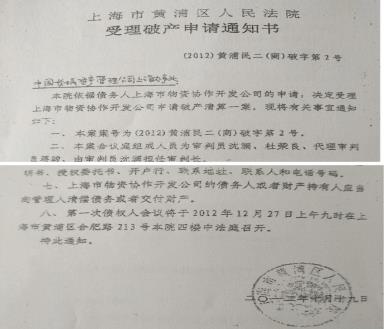 据上海黄浦区人民法院受理破产申请通知书(2012)黄浦民二(商)破字第2号显示: