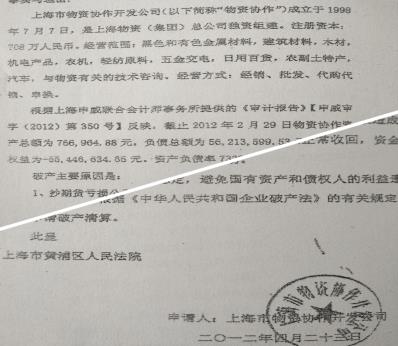 2012年4月23日,物资协作公司向黄浦区人民法院申请破产,申请书显示:根据上海申威联合会计师事务所提供的《审计报告》【申威审字(2012)第350号】反映,截止2012年2月29日物资协作资产总额为766,964.88元,负债总额为56,213,599.53元,所有者权益为-55,446,634.65元。资产负债率7329.36%。