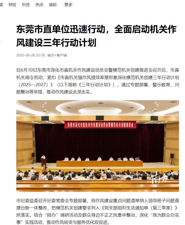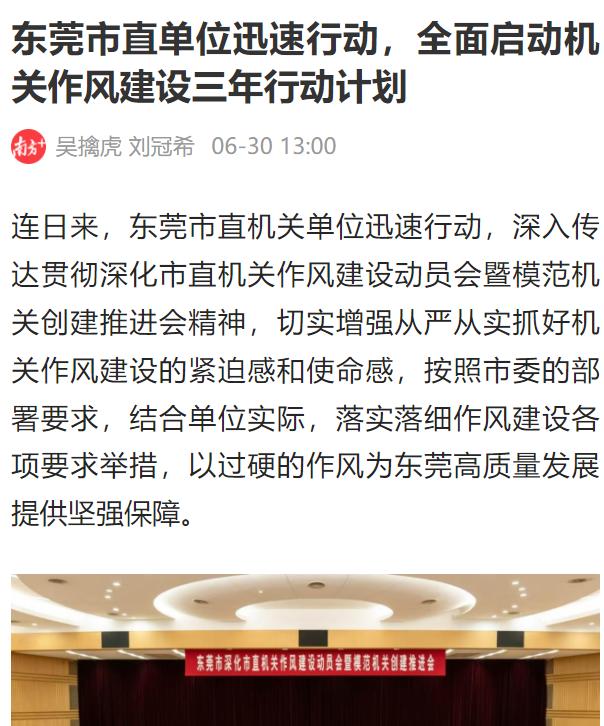 6月26日,南方+发布《东莞市直单位迅速行动,全面启动机关作风建设三年行动计划》,报道称自6月10日东莞市深化市直机关作风建设动员会暨模范机关创建推进会召开后,市直机关闻令而动,紧扣《市直机关强作风提效率塑形象深化模范机关创建三年行动计划(2025—2027)》(以下简称《三年行动计划》),通过专题部署、警示教育、问题整治等俅耄贫鞣缃ㄉ枳呱钭呤怠�