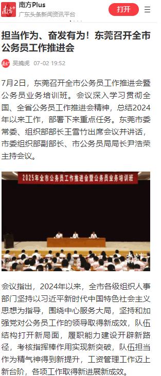 7月2日,南方+发布《担当作为、奋发有为!东莞召开全市公务员工作推进会》:会议深入学习贯彻全国、全省公务员工作推进会精神,总结2024年以来工作,部署下来重点任务。东莞市委常委、组织部部长王雪竹出席会议并讲话,市委组织部副部长、市公务员局局长尹浩荣主持会议。