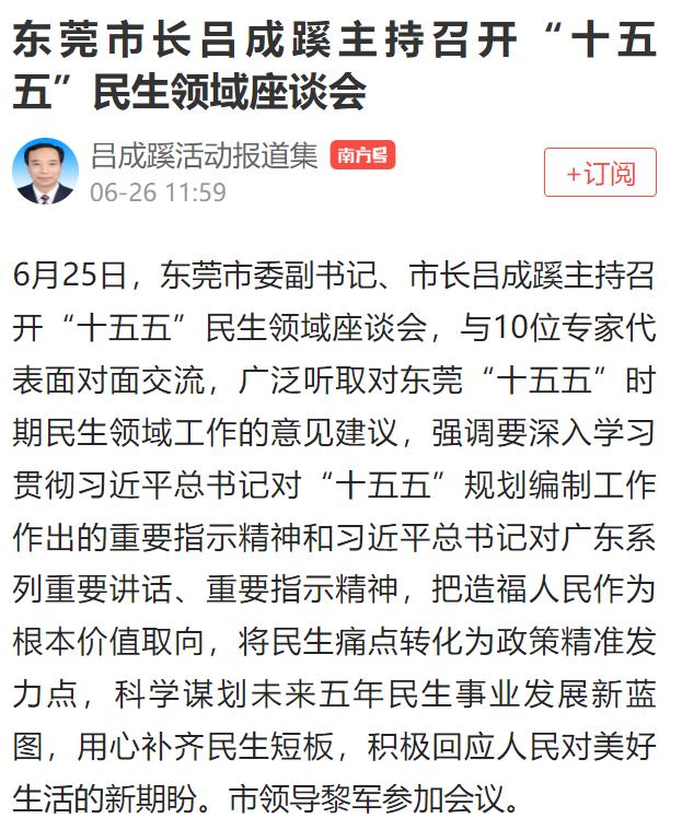 6月26日,南方+发布《东莞市长吕成蹊主持召开“十五五”民生领域座谈会》:6月25日,东莞市委副书记、市长吕成蹊主持召开“十五五”民生领域座谈会,会上他强调;把造福人民作为根本价值取向,将民生痛点转化为政策精准发力点,科学谋划未来五年民生事业发展新蓝图,用心补齐民生短板,积极回应人民对美好生活的新期盼。