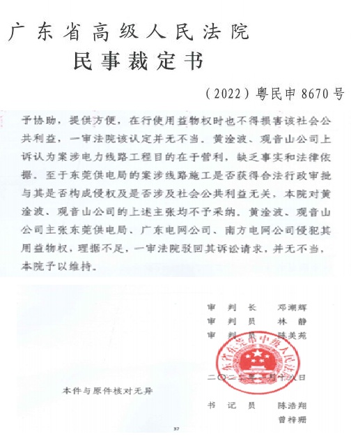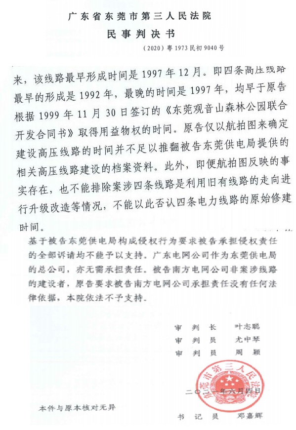 三是“根据《供用电合同》将电力供应至公园的产权分界点。在高压线塔架设纠纷中,观音山公司三次诉讼均败诉,法院认定线路建设早于公司承包经营,未构成侵权。”就此案件,多位法学专家认为:案涉四条高压线路的真实初始修建时间和是否为观音山公司承包前就已存续存在一定争议,一审、二审法院直接认定属观音山公司承包前已存续或变更升级改造而来是否得当?为何观音山均败诉?法院认为这些高压线并未架设在公园的红线范围内,故供电部门没错。而公园提供给法院证明高压线确实架设在公园范围内的证据文件《观音山国家森林公园总体规划》以及各工程施工的时间等均未被法院认可。出现这种结局,如果说此案没有行政力量干预司法,鬼都不信!而南方电网正是通过干预司法这种违法行为,为自己继续违法再次打脸了社会和法治。笔者倒是要请求广大游客,您们到观音山公园旅游时,看看那几十座高压线铁塔是不是在公园内的森林里,多照些照片发到朋友圈,让全社会都看一看,南方电网和东莞的某些法官是如何的颠倒黑白狼狈为奸,如此的睁眼说瞎话进行判案,这笔账今后一定要算的,毕竟太扯了。