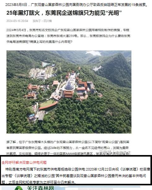 于是撰稿人仔细查看了这篇1万余字的文章,发现了又这么100字提及了南方电网问题“特别是南方电网属下的东莞市供电局拒绝给公园供电:2020年12月22日央视《谈事说理》栏目播出专题“《谈事说理》之搁浅的公园”其中就着重谈到观音山国家森林公园悬而未决的基本供电问题,之后全网和知名专家为之呼吁至今仍未解决。”同时配了一幅网文截图。