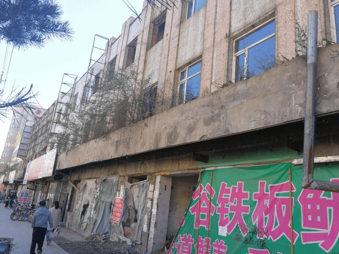 初秋的九月,记者站在繁华的太祖路上看到,一排一百多米长的三层沿街门市房异常破败。被拆掉门窗的窗户,脱落了瓷砖的漆黑的外墙,曾用来遮挡门窗的几片塑料布挂在墙上随风劲舞,二楼阳台处长满了杂草和灌木,一楼紧锁的卷帘门上锈迹斑斑且落满了灰尘,有的用木板或破布帘子作门挡在门口,有的没有门窗的房间里堆满了垃圾,还伴有阵阵恶臭......只有少数门市房仍在使用营业。这一切,与周围的高楼大厦、绿树成荫的街道形成了鲜明的对比。