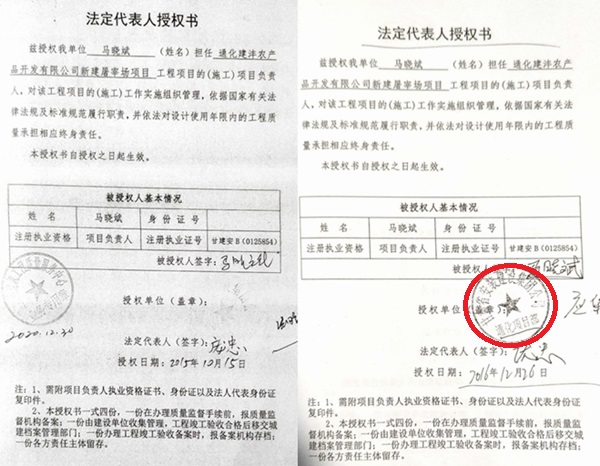 1、备案材料显示,施工单位的法人授权委托书存在弄虚作假问题,加盖的公章不是甘肃省安装建集团公司的公章,而是加盖的甘肃省安装建集团公司通化项目部的印章,不能认定为甘肃安建的授权。