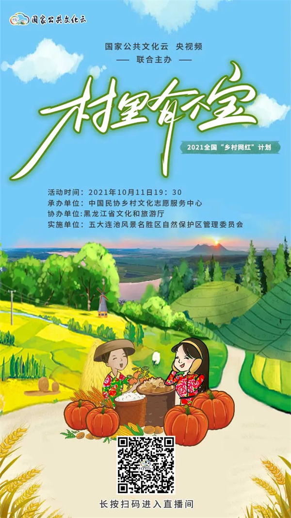 2021年10月11日19:30,由文化和旅游部全国公共文化发展中心、中央广播电视总台视听新媒体中心联合主办,中国民协乡村文化志愿服务中心承办,黑龙江省文化和旅游厅协办,五大连池风景名胜区自然保护区管理委员会实施的“乡村网红”培育计划 走进神奇的五大连池将在国家公共文化云进行直播。