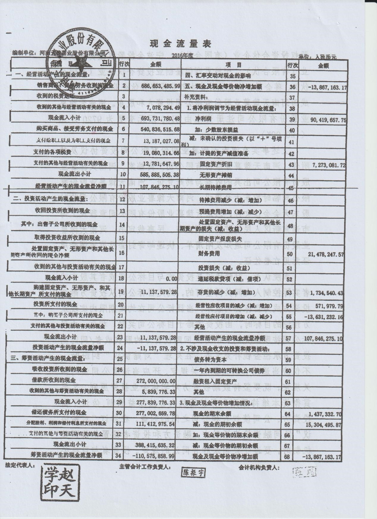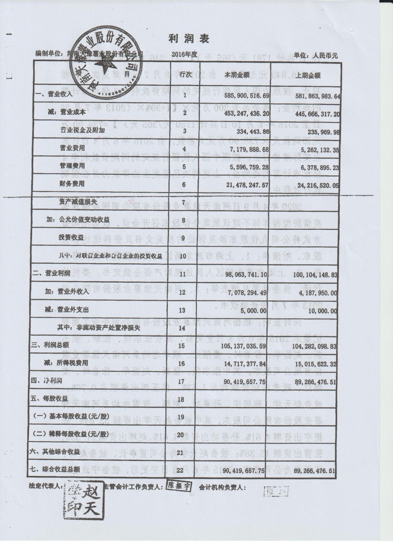 王律向记者展示了天豫薯业提交的2016年财务报表审计报告复印件和审计报告相关说明,《现金流量表》和《利润表》页面均加盖了天豫薯业的公章、法人赵天学的印鉴和主管会计工作负责人陈振宇的印章。审计报告相关说明出具日期为2017年12月13日,加盖有天豫薯业公章和赵辉、郭林二人签名,说明中提到“以下说明仅代表我们个人意见,不代表天豫薯业、河南豫和会计师事务所(普通合伙)、河南正延会计师事务所(普通合伙)的意见。”、“赵辉作为天豫薯业的股东、董事、董事会秘书,2015年以来历次的董事会会议中均没有审议过公司分红的议案,也没有收到过分红款。2016年度审计报告中体现的分红事项不存在。”以及“河南豫和会计师事务所(普通合伙)、河南正延会计师事务所(普通合伙)不具有证券期货从业资格,执业质量不高,出现明显的钩稽关系错位”等内容。