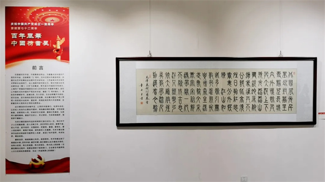 庆祝中国共产党成立100周年 喜迎建国72周年,由上海榜书研究院主办,在常州市市委宣传部、常州市文学艺术界联合会、中国文化艺术发展促进会榜书艺术研究会等部门的指导下、由常州新北区书法家协会、江苏飞拓集团、常州孟河书画院联合承办,上海广种福田书画院协办的《百年风华 中国榜书展》9月28日在常州刘海粟美术馆隆重举行。