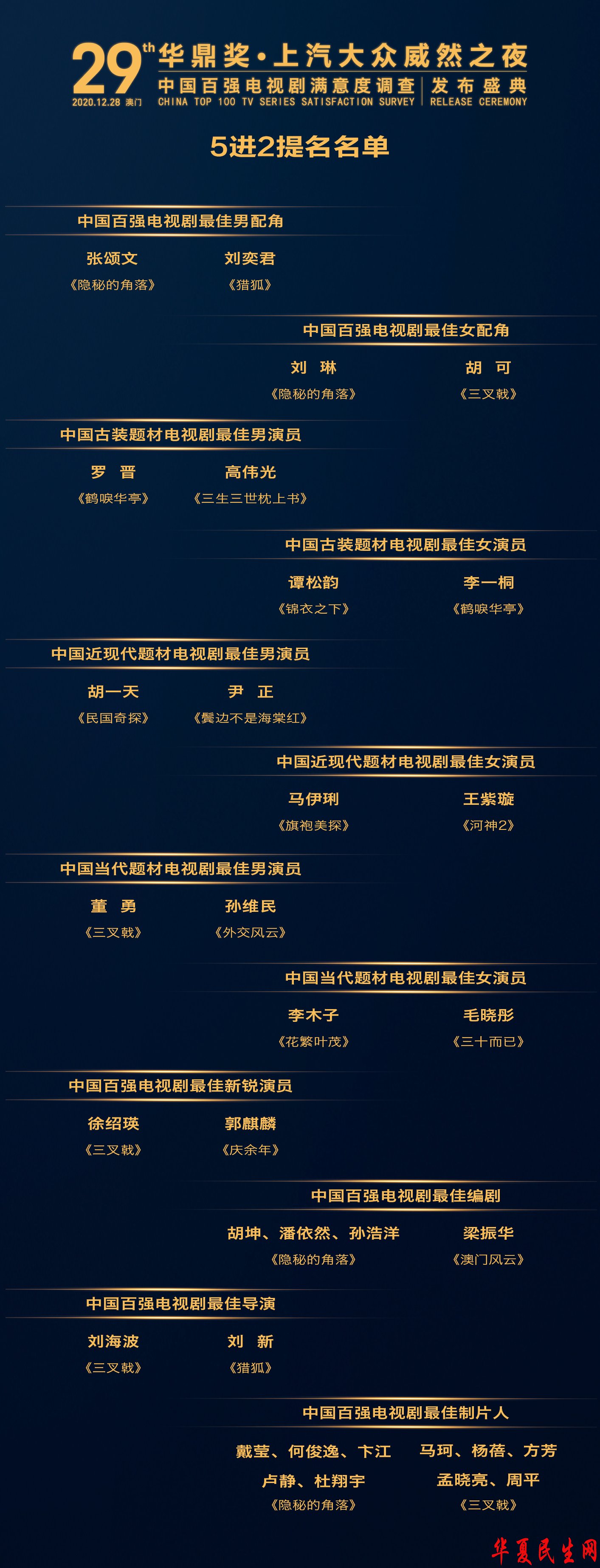 12月23日,华鼎奖集团在澳门公布了第29届华鼎奖上汽大众威然之夜中国百强电视剧满意度调查各大奖项提名名单“五进二”观众网络投票结果,综合华鼎奖多个官方网络平台票数统计显示,张颂文和刘奕君在最佳男配角的角逐中脱颖而出,胡可和刘琳在最佳女配角的竞争中票数领先。其他各个奖项前两名也各有归属。备受关注的全国观众最喜爱十佳演员名单,将在下次公布。