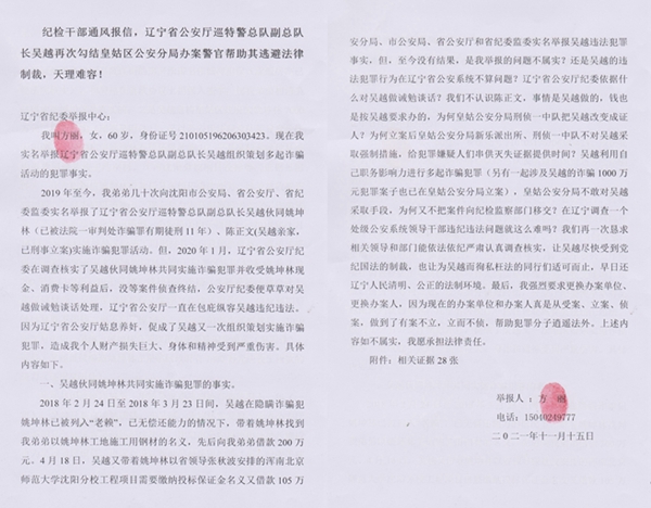 目前,政法队伍教育整顿工作还在进行中,我们多次向区公安分局、市公安局、省公安厅和省纪委监委实名举报吴越违法犯罪事实,但至今没有结果,是我举报的问题不属实?还是吴越的违法犯罪行为在辽宁省公安系统不算问题?辽宁省公安厅纪委依据什么对吴越做诫勉谈话?我们不认识陈正文,事情是吴越做的,钱也是按吴越要求办的,为何皇姑公安分局刑侦一中队把吴越改变成证人?为何立案后皇姑公安分局新乐派出所、刑侦一中队不对吴越采取强制措施,给犯罪嫌疑人们串供灭失证据提供时间?吴越利用自己职务影响力进行多起诈骗犯罪(另有一起涉及吴越的诈骗1000万元犯罪案子也已在皇姑公安分局立案),皇姑公安分局不敢对吴越采取手段,为何又不把案件向纪检监察部门移交?在辽宁调查一个处级公安系统领导干部违纪违法问题就这么难吗?我们再一次恳求相关领导和部门能依法依纪严肃认真调查核实,让吴越尽快受到党纪国法的制裁,也让为吴越而徇私枉法的同行们适可而止,早日还辽宁人民清明、公正的法治环境。最后,我强烈要求更换办案单位、更换办案人,因为现在的办案单位和办案人真是从受案、立案、侦案,做到了有案不立,立而不侦,帮助犯罪分子逍遥法外。上述内容如不属实,我愿承担一切法律责任。