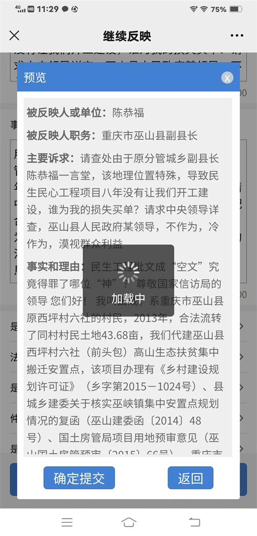 田某在办理施工许可证的道路上可谓是坎坷至极,巫山县建委也是笑脸相迎有头无尾,同样的手续巫山的其他民生工程安置点正在热火朝天施工中。田某经熟人联系到了时任巫山县分管城建的副县长陈某,得到的答复是:(该地理位置特殊)(巫山方言:莫空掏力,书面语言:白费功夫)。无奈之举民生项目负责人被迫走上了信访路线索要结果,据2021年6月11日上午九点半巫山县信访办公楼巫山县党政领导干部接待群众登记表内容显示,诉求已建成房屋办证,基础设施,后续建设等内容反应到巫山县信访局。得到的结果仍然是石沉大海
