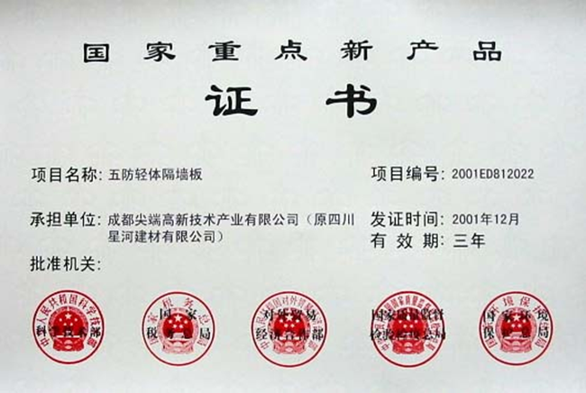 周兴和发明的五防清体隔墙板即植物纤维建筑板材获国家重点新产品证书