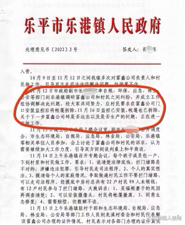 夏长喜提供的一份《乐平市关于办理夏长喜信访事项处理意见书》(以下简称:《意见书》)也印证了这一点,《意见书》第二条第一款内容显示:“11月12日市领导率自规、环保、应急、林业、公安等部门到乐港镇调研富鑫公司和村民之间的纠纷,并成立工作组协调解决此问题,经大家共同努力,应村民要求在富鑫公司门口安装监控后将帐篷拆除,11月16日监控已安装,帐篷也已拆除,关于下一步富鑫公司砖是否运出以及是否生产的问题,正在进一步做工作。”