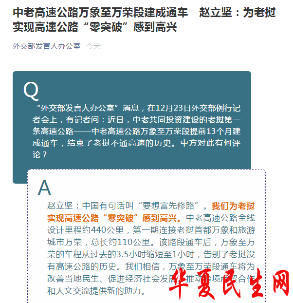 中国网12月23日讯 据“外交部发言人办公室”官方微信公众号消息,针对中老高速公路万象至万荣段提前13个月建成通车一事,中国外交部发言人赵立坚在今日例行记者会上表示,中国有句话叫“要想富先修路”。中方为老挝实现高速公路“零突破”感到高兴。